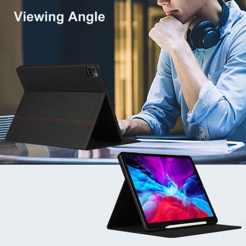 Skydda hela din iPad Pro 12.9'' (2021) med detta exklusiva äkta litchi-läderfodral som även fungerar som handsfreehållare.