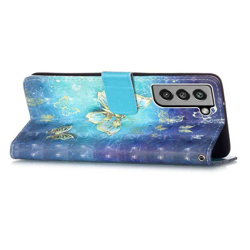 The Golden Butterflies-skalet säkrar lyxigt och effektivt Samsung Galaxy S21 FE samtidigt som det ger plånbok och handsfree-stöd.