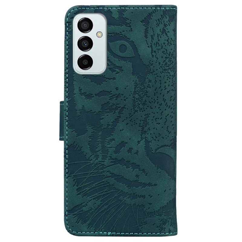 Skydda Din Samsung Galaxy M13 Mot Väder Och Vind Med Detta Tiger Print-Fodral I Konstläder Som Även Fungerar Som En Plånbok.