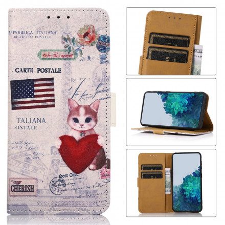 Din Samsung Galaxy A22 4G skyddas av ett fodral med internationella stämplar med sin resande katt!