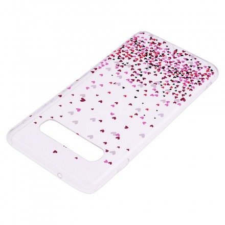 Ett genomskinligt skal, på vilket är ritade flera röda hjärtan, som smälter in med de fina kurvorna på din Samsung Galaxy S10e.
