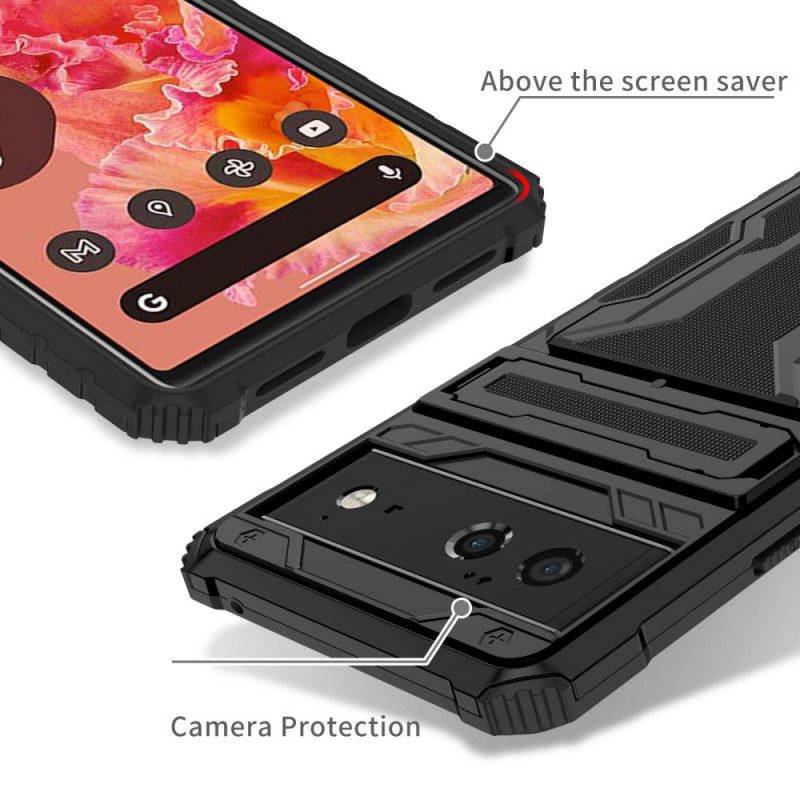 Upptäck detta hybridfodral för din Google Pixel 6 som har en korthållare med dragkedja och ett stativ.
