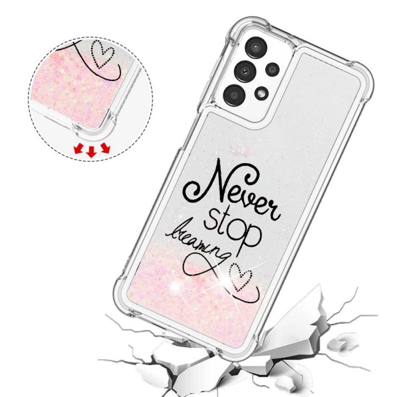 Din Samsung Galaxy A13 är mycket väl skyddad med detta Never Stop Dreaming glitterfodral som kännetecknas av sin finess.
