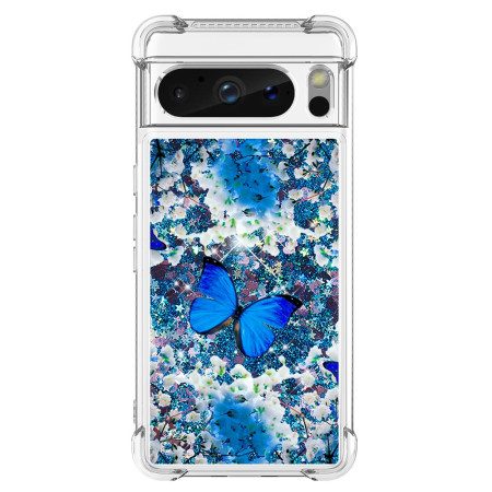 Ett Superglitterfodral Dekorerat Med En Blå Fjäril För Att Personligen Säkra Din Google Pixel 8 Pro.